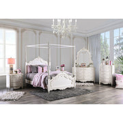 A room fit for a princess! The four poster canopy bed is delicately decorated with a carved motif design and finished in pearl white. The matching dresser is enhanced with a vanity jewelry box and matching mirror. The hutch style desk, chair, chest and night stand round out the perfect bedroom set for a princess.