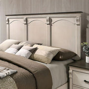 This bedroom set will fit in well in a Mediterranean-inspired space. The headboard and footboard feature fluted panels and columns topped with foliage details reminiscent of classical architecture. The color palette hints at history as well--the antique white finish partnered with the gray top pieces lends a unique kind of worn-out charm. Simple horizontal dark bronze hardware on the case goods completes this fine-looking ensemble.