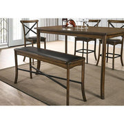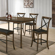 Bring elegance to the table with this fine counter-height dining room set from the Buhl II Collection. The saber legs and graceful curves of the rectangular table top add a level of sophistication to the design, and is enhanced by the burnished oak finish. The padded fabric and cross-back design of each chair provides a comfortable place to sit at your next meal or posh event.