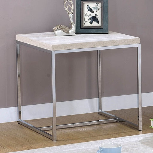 Ninove I White/Chrome End Table, 23 1/2"L X 23 1/2"W X 22"H, 53.5lbs. This contemporary set of living room tables has a unique curled shelving desi...
