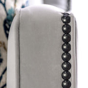 MONTECELIO Sofa, 91"L X 39"W X 38"H (SEAT HT: 19", SEAT DP: 25"), 142lbs. Enjoy a wonderful, relaxing day on this transitional-style American-built sofa! Dark wooden legs support the piece, while the individual nailheads add an air of luxury. The one piece bench-style back cushion is attached to the frame, and in front are accent pillows with beautiful pops of navy striped and floral patterns. Soft to the touch, the velvet-like fabric wraps around the piece in an inviting, warm light gray color.