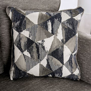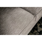 White flecking enhances the otherwise light gray fabric of this modern made-in-the-U.S.A. love seat that comes complete with cushions and pillows!