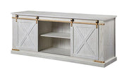 BORREGO TV Stand, Antique White, 72"W X 20"D X 29 7/8"H, 169.4lbs. For those looking to add to their rustic abode, this TV console will fit right in. It comes in a beautiful farmhouse inspired design, with sliding doors and X front panels that take the ranch back into your living room. Metal accents in the front help emphasize the motif while adding a bit of extra flair to a rather simple design. Behind the doors are open shelves where your electronics and video equipment reside.