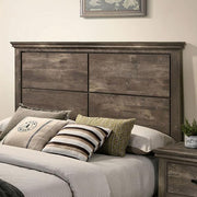 FORTWORTH Cal.King Bed, 88 5/8"L X 77 1/4"W X 54"H, 132.3lbs. A tasteful combination of classic details with a pinch of rustic influence, this bed is a masterpiece in its own right. Every top and bottom edge is trimmed with beautiful molding details, adding visual heft to this bold piece. Multi-panel design for the headboard and footboard complements the molding nicely, reinforced by the massive bracket legs. The gray finish and replicated wood grain brings the barnyard appeal, further enhanced by the black metal hardware on the case goods.