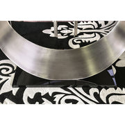 Graceful and dignified, this one-of-a-kind table will make any meal feel like a fanciful feast. Featuring a unique chrome base, this stunning fixture sits atop a contrasting black flat base as it holds up a beveled edge glass table top. Complete this piece with the coordinating round cut-out metal back chairs, which feature black foam filled seat cushions.