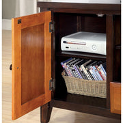 This handsome TV console has a mixed finish look, with the body finished in dark cherry and the drawer panels and cabinet doors finished in dark oak. Product Dimensions: 72"W x 18"L x 28.25"H